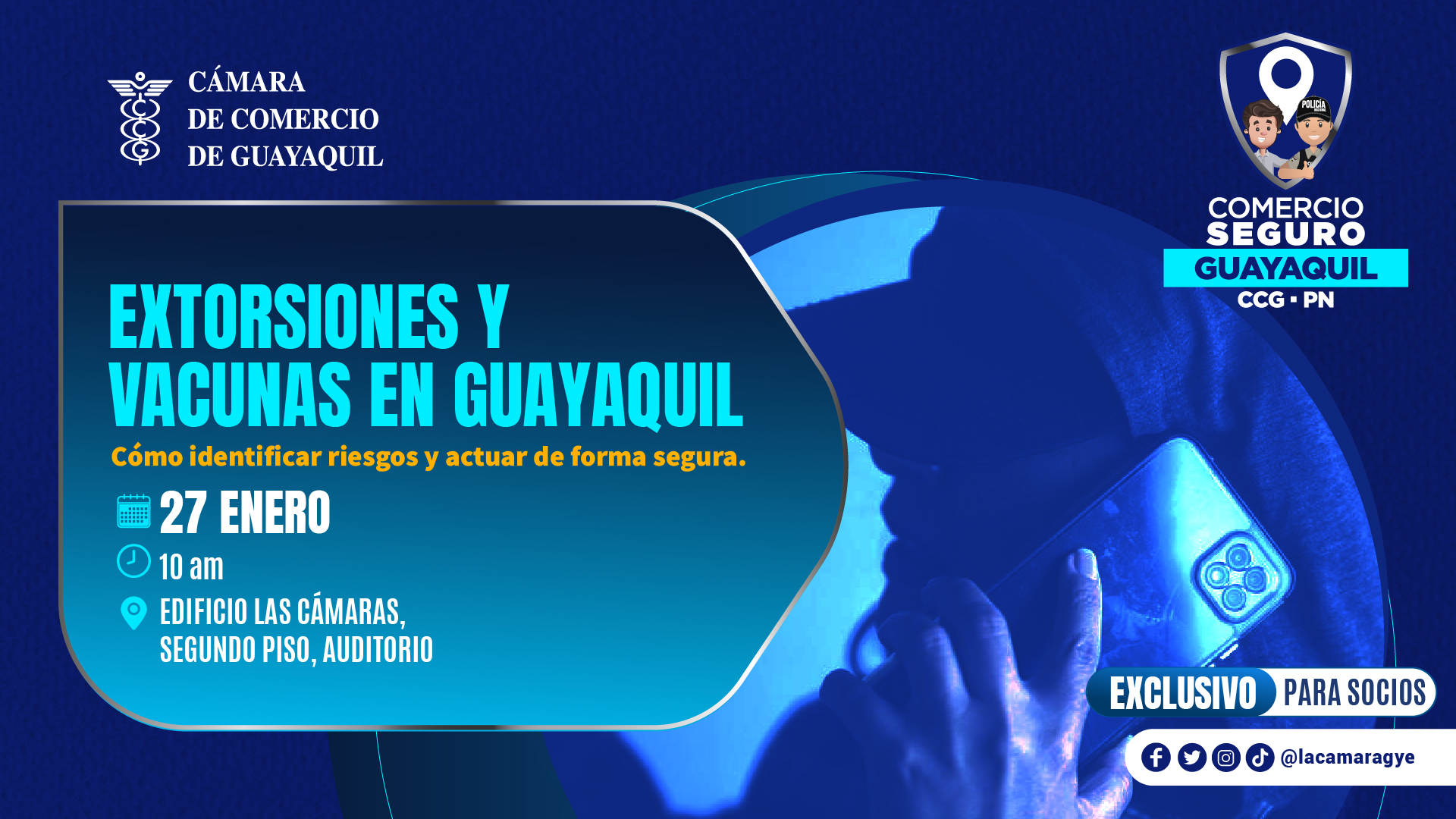 Aprenda a identificar riesgos y a actuar de forma segura ante las extorsiones y "vacunas" que afectan a la ciudad. Organizado por la Cámara de Comercio de Guayaquil y la Policía Nacional, este taller ofrece herramientas clave para la seguridad de su negocio y su personal.